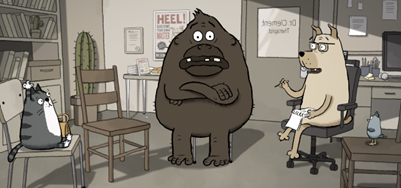 session with a dog as the therapist and slug, a pig, a small bird, a cat, and a
